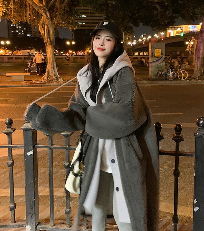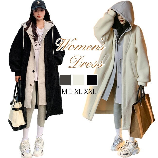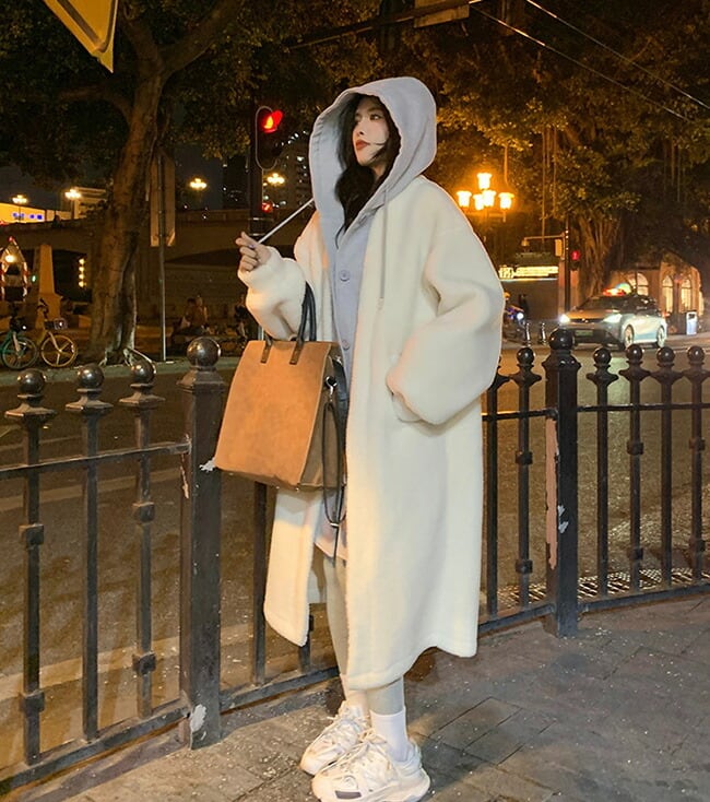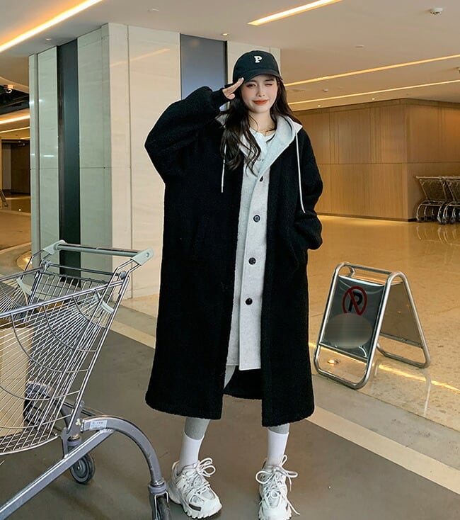 冬の新作、韓国ファッション風のロングフード付き重ね着風コートが登場。