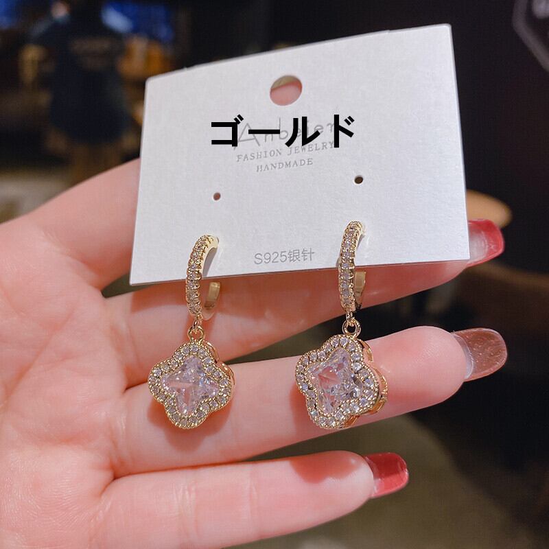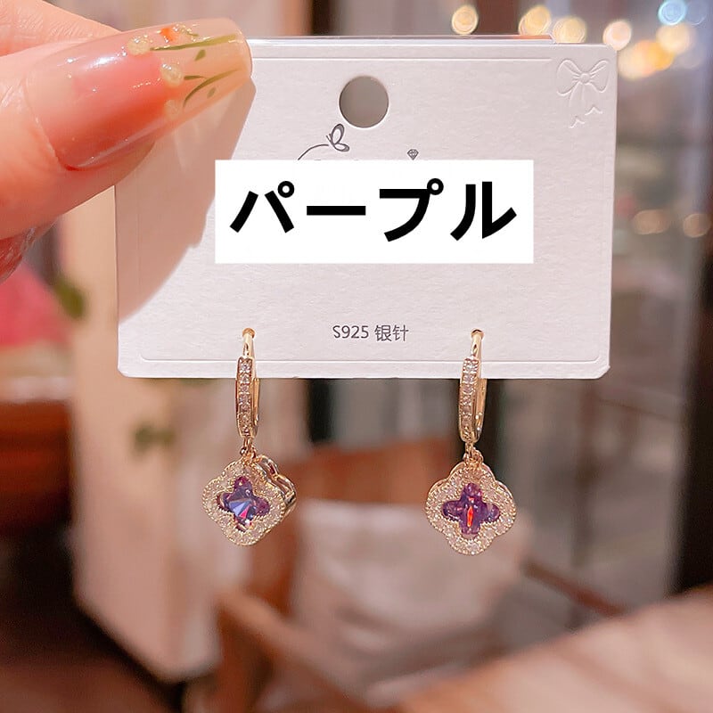 幸運を呼び込んでくれるかのような素敵なクローバーモチーフにキュービックジルコニアが輝くピアスです♪ シルバーとゴールド、パープルの3カラー展開で、色々なスタイルに合わせやすいアイテムとなっています。