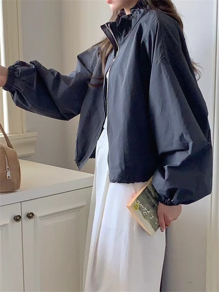 ゆとりある着心地 薄手ショートコート|立襟 フリル縁 コード調整可能 カジュアル