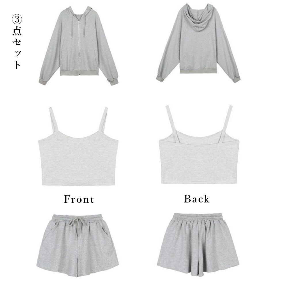 可愛い 部屋着セット 長袖 ルームウェア カジュアル ジップアップパーカー ショート丈キャミソール ショートパンツ 春夏