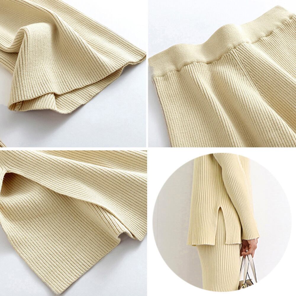 ニットアンサンブル スリット リブニットトップス 長袖 カジュアル ニットセミワイドパンツ 上下セット 30代40代