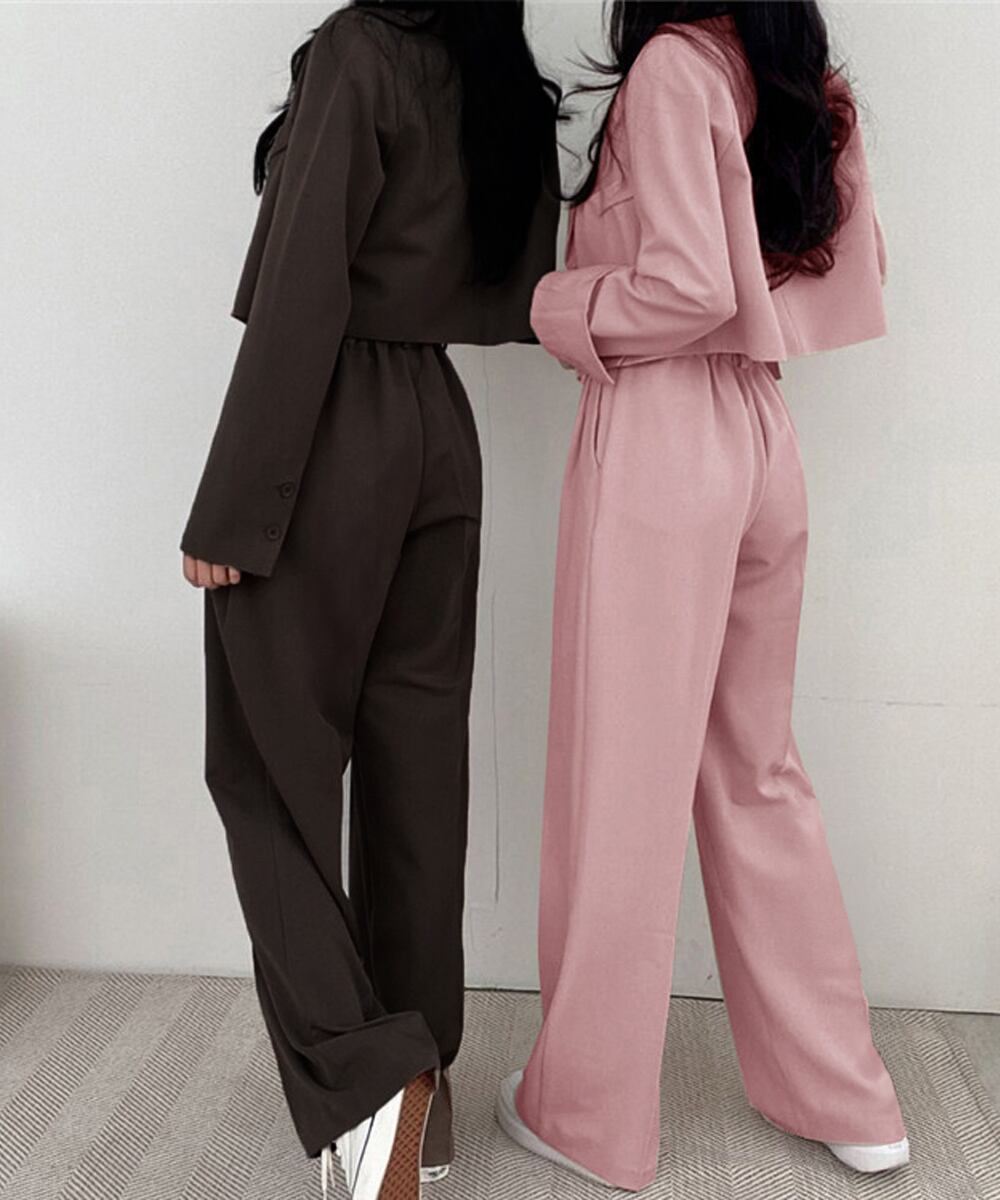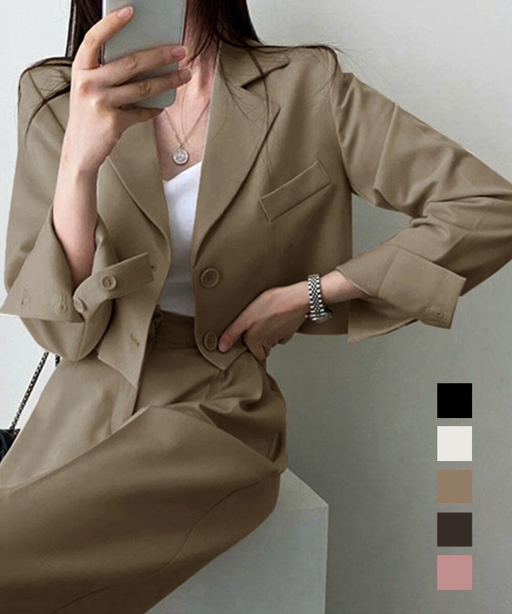 洗練された印象を与えるテーラードジャケットとパンツのスーツセットが登場しました!カジュアルながらも女性らしさを引き立てるデザインで、オフィススタイルやビジネスシーンにぴったりなアイテムです。全5色展開で、お好みに合わせて選べます。