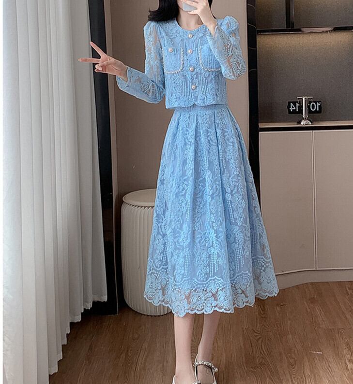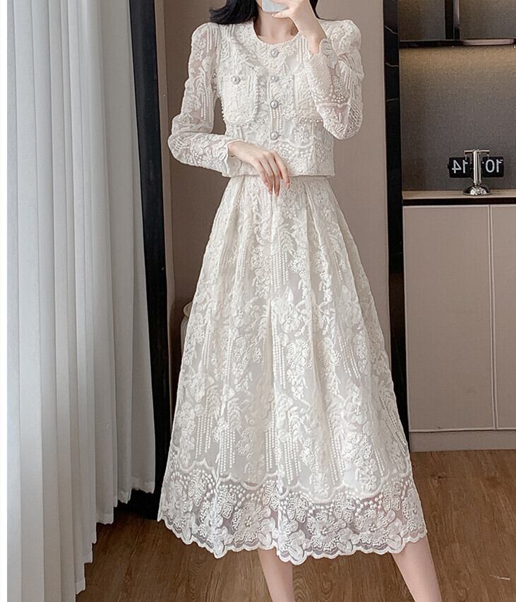 セットアップ アウター 長袖 フレアスカート 花柄刺繍 ロングスカート 体型カバー レースドレス 上下セット