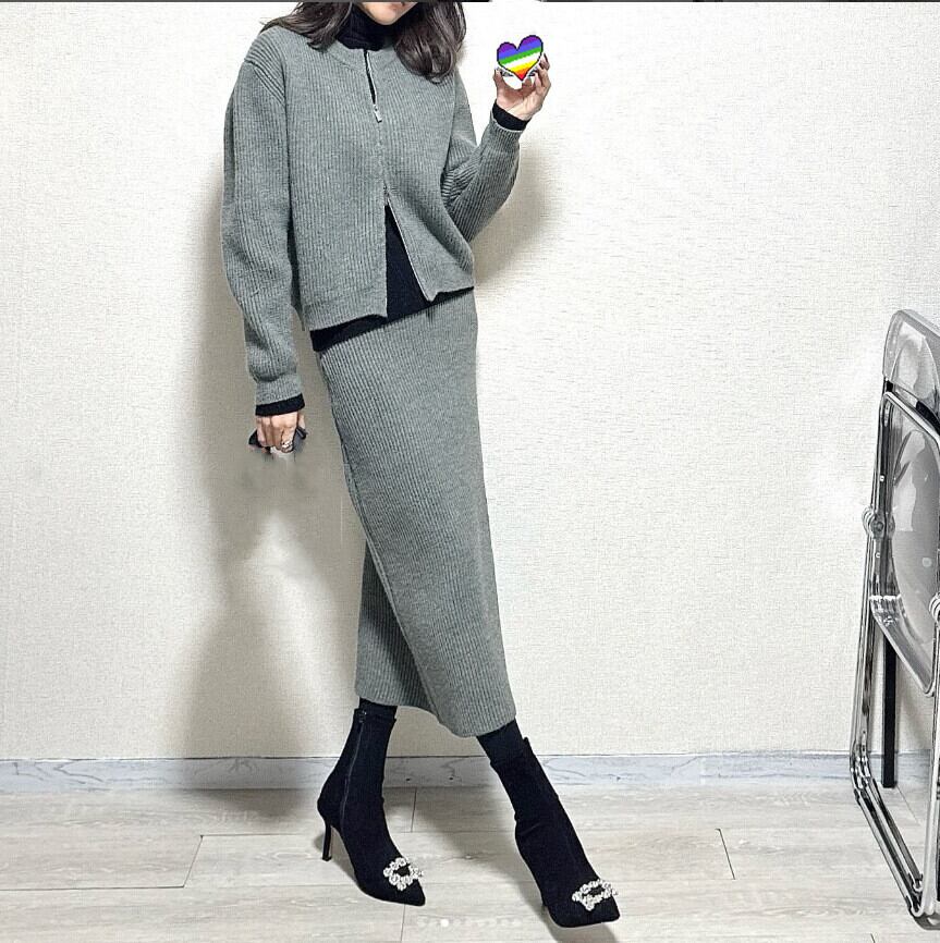 お洒落に気を使う女性にぴったりな、ニットカーディガンとスカートの上下セットが新登場!トレンド感溢れるデザインで、デイリーから特別な occasion まで幅広く活躍します。