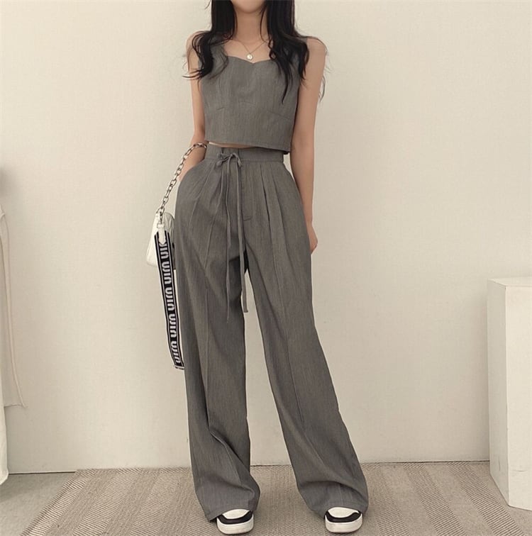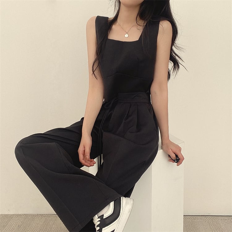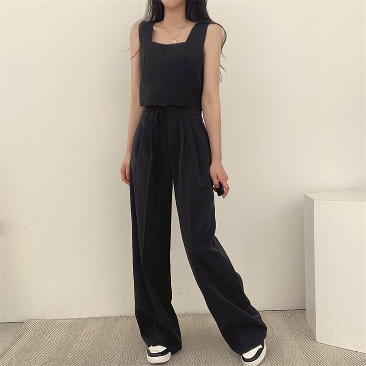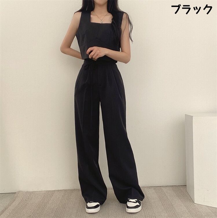 夏季コーデセット 角形カラーノースリーブ 裾上げベスト+腰紐付きロングパンツ