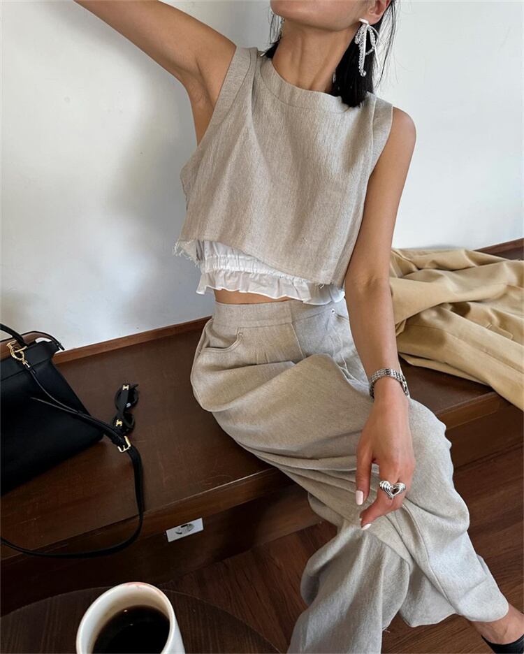 ハイウエストロングパンツセット レトロカラーリングベスト ノースリーブ春夏おしゃれ着