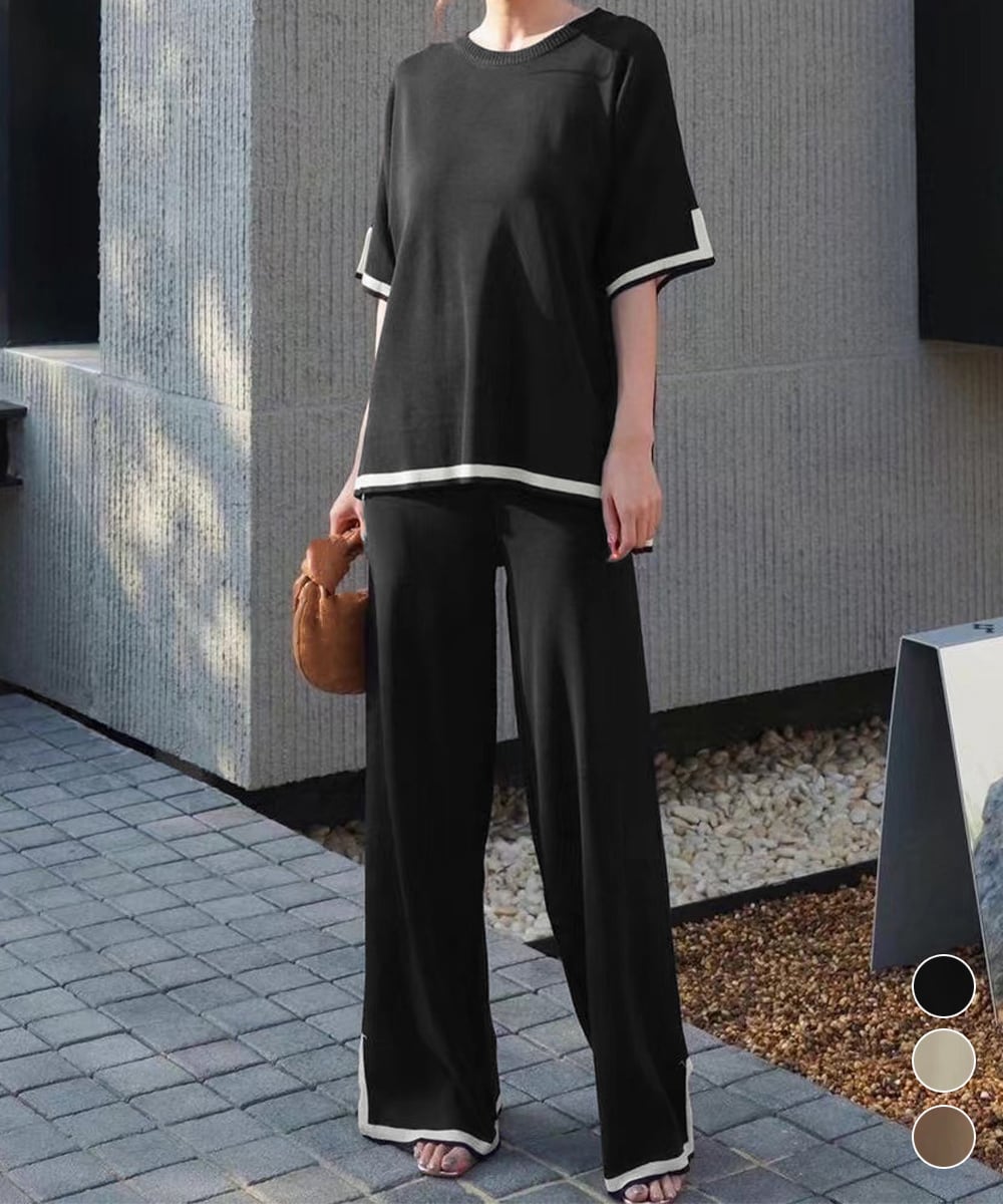 スタイリッシュさと快適さを兼ね備えた「配色スリットニット」と美しいシルエットのパンツのセットです。このアイテムは、カジュアルな日常使いからランチデート、さらにはちょっとしたお出かけまで幅広いシーンで活躍することが期待できる一品です!