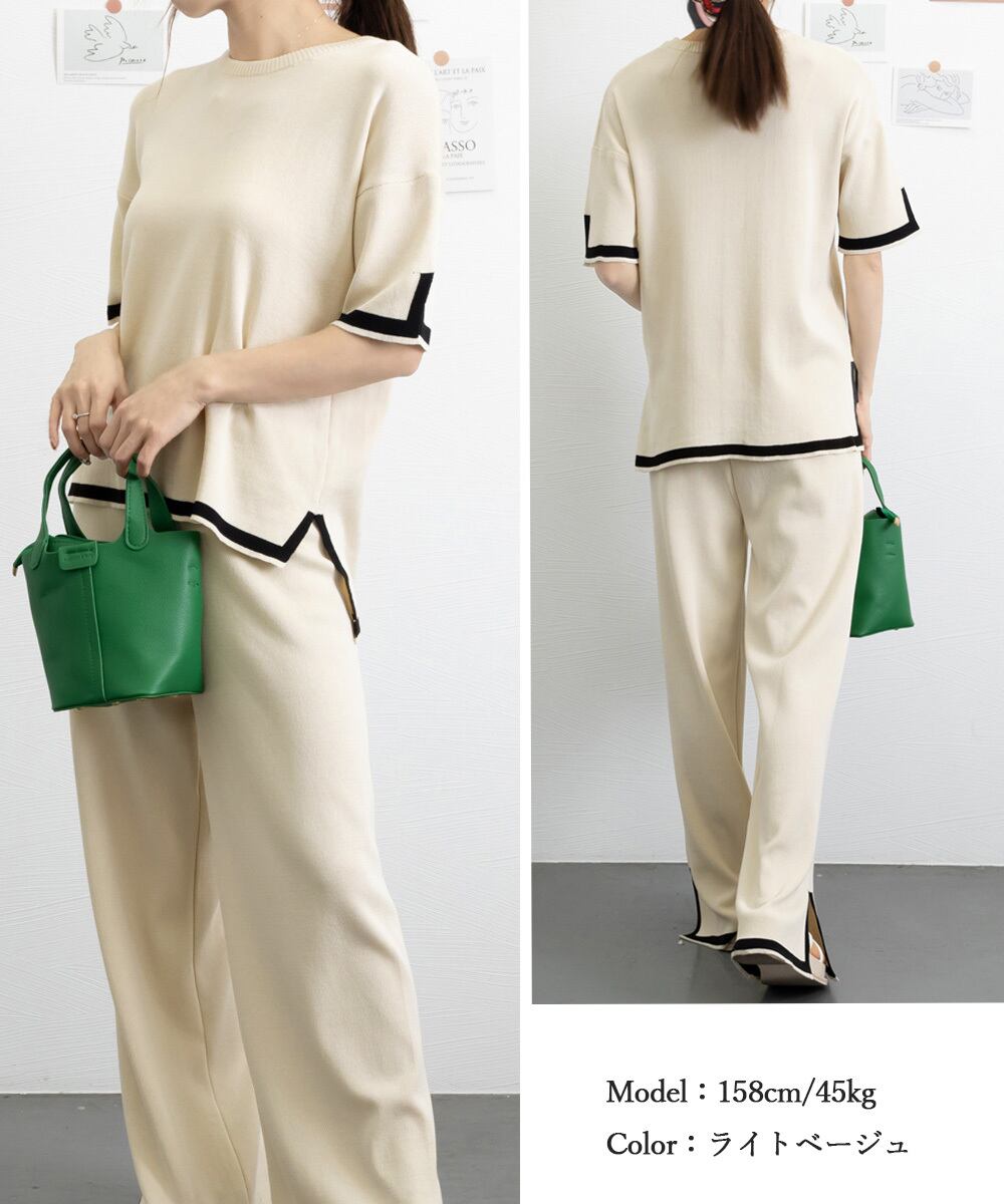 お気に入りのスニーカーやフラットシューズと合わせて、日常のカジュアルスタイルを楽しんではいかがでしょうか?この「セットアップ 配色スリットニットとパンツ」で、あなたらしいおしゃれを表現してください!このアイテムをお見逃しなく♪