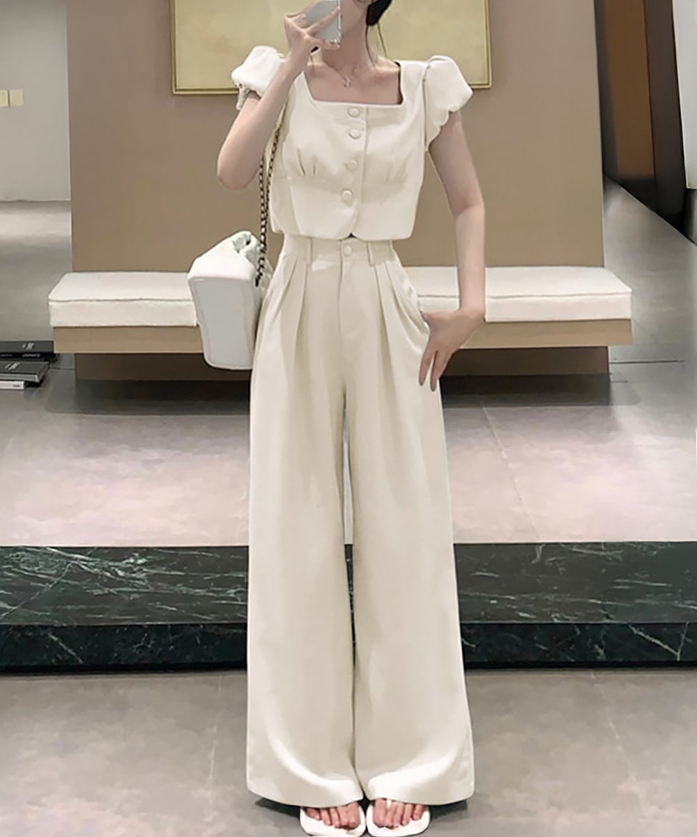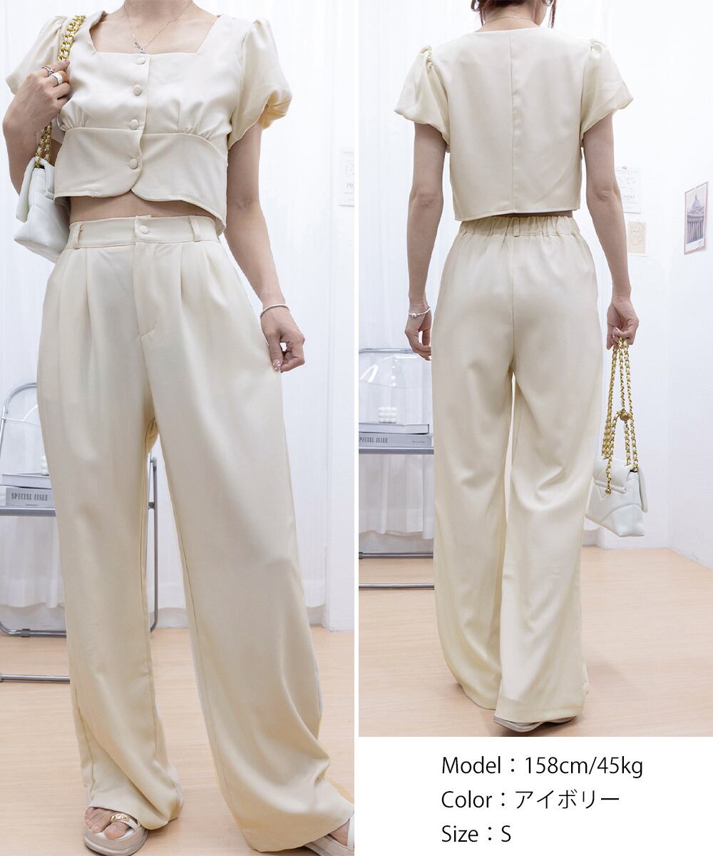 トップスはパフ袖とクロップド丈のデザインで、女性らしいシルエットを演出