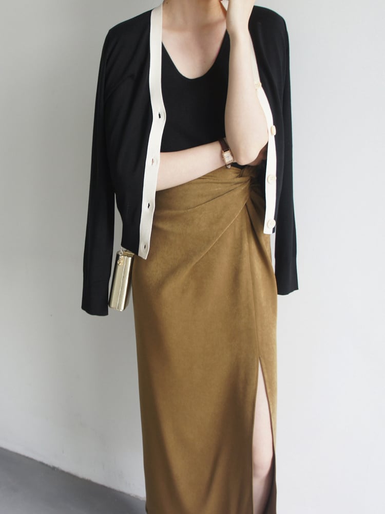 2. 膝下丈のスカートはサイドスリットが施され、程よい抜け感をプラス。軽やかなシルエットが、あなたのスタイルをより一層引き立てます!