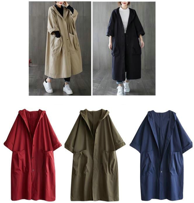 春秋新作アート系オーバーサイズ 膝下ロングトレンチコート フード付き大容量ポケット 通勤カジュアル兼用