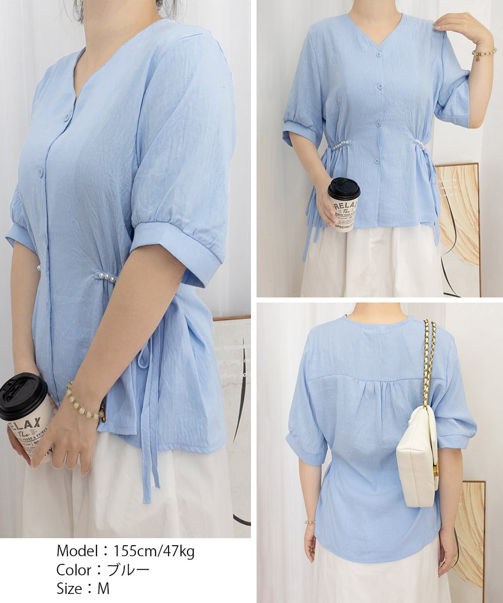 Vネックブラウス ウエストマーク 大人可愛いシャツ白が新登場しました!オフィスカジュアルにぴったりなデザインで、着やせ効果も期待できるゆったりとしたシルエットが魅力のアイテムです♪