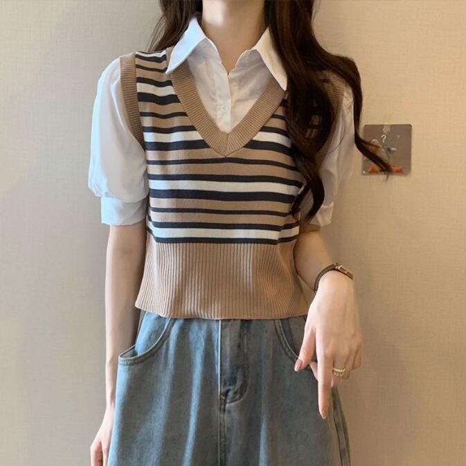 2025新作 レディース ニットベスト シャツ レイヤード 重ね着 ツーピーストップス Vネック トレンド