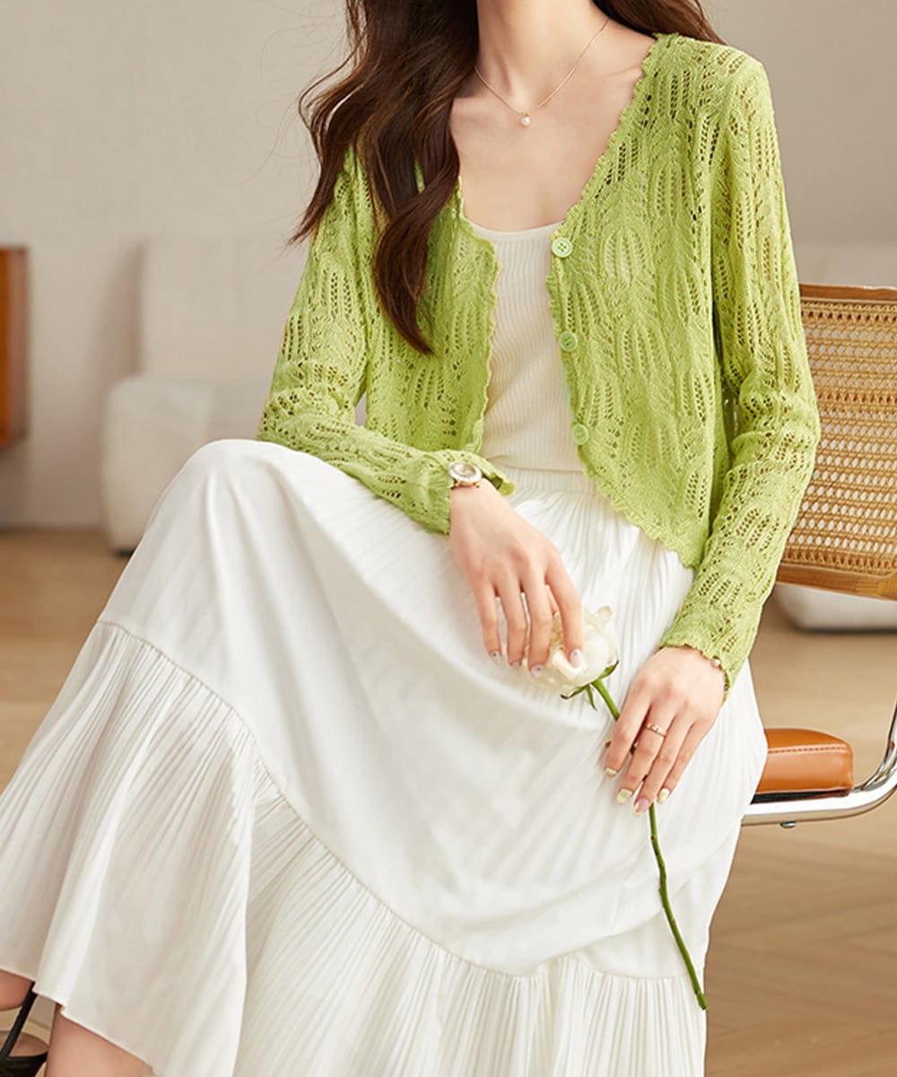 この「透かし彫りニットカーディガン」を取り入れることで、何気ない日常を特別なものに変えるスタイリングが楽しめます!涼やかな印象で自分らしいおしゃれを表現し、春夏のコーディネートを思い切り楽しんでください♪