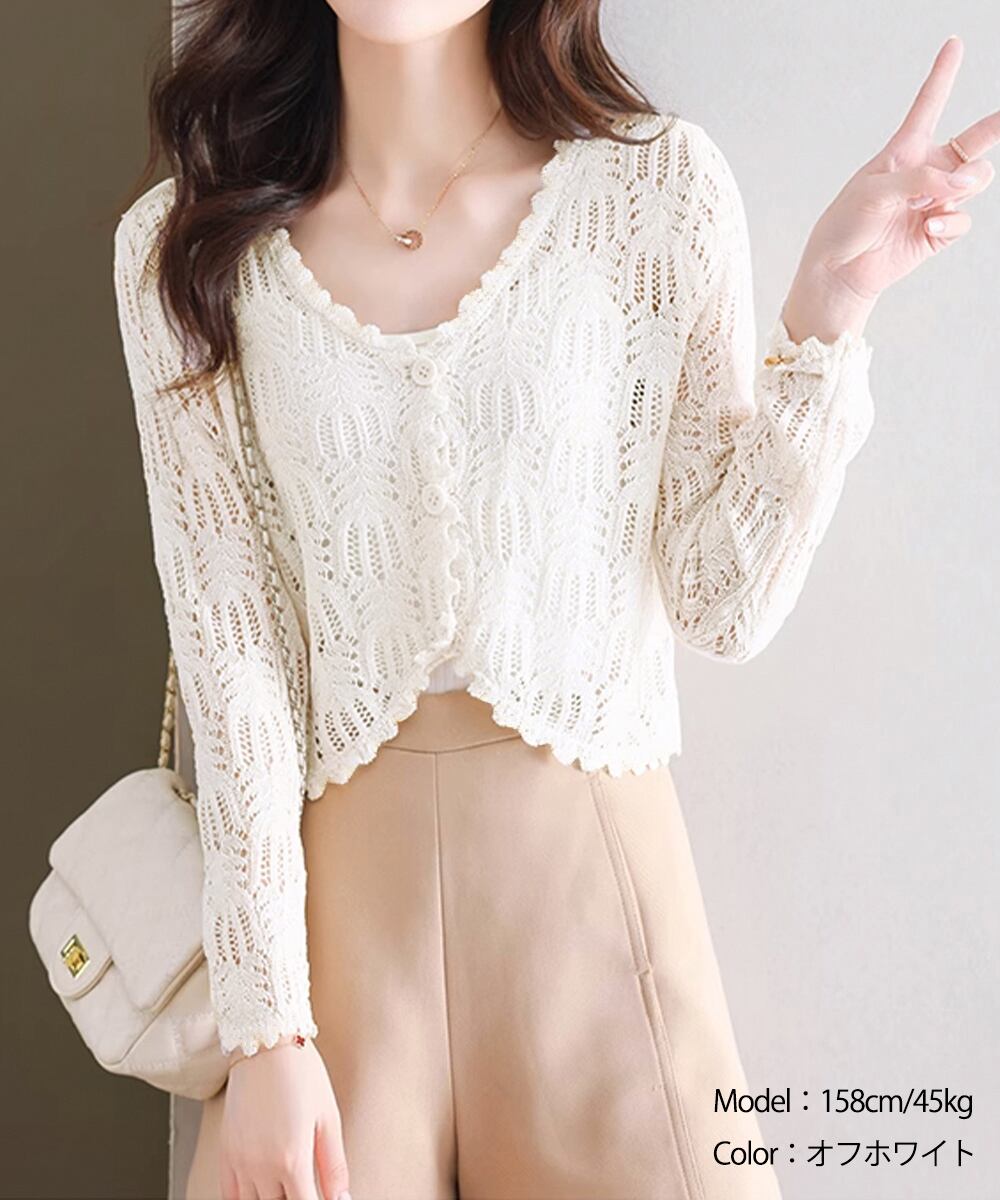 スカラップの縁取りとボタン付きデザインがフェミニンな印象をプラス。長袖仕様で、冷房対策や紫外線対策にも最適な一枚です。どんなコーディネートにも合わせやすく、普段使いから特別なお出かけまで幅広く対応できます♪