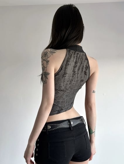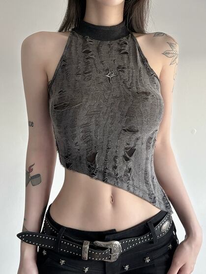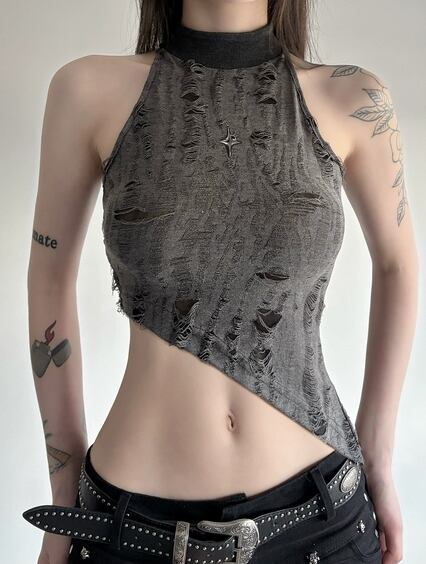 スタイリッシュでありながらカジュアルさも兼ね備えた「タンクトップ」が登場!クルーネックデザインが首元をすっきり見せ、細身のシルエットが女性らしいラインを引き立てます。ダメージデニムの風合いが程よいアクセントとなり、シンプルながらも唯一無二のスタイルを演出します♪