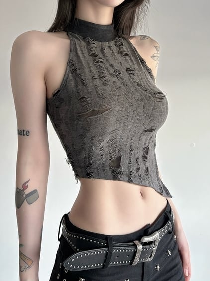 トップス タンクトップ キャミソール クルーネック 細身 スリム タイト ダメージデニム