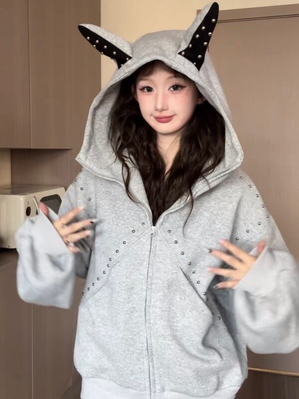 この「耳つきフードジップアップパーカー」を取り入れることで、秋冬のコーディネートがぐっと映えます!お友達とのお出かけや、カジュアルなデートシーンにもぴったりな一着です♪