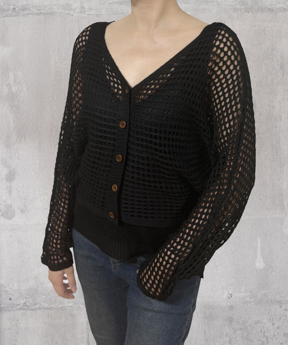 1. メッシュカーディガンは、透け感があり軽やかな印象で、カジュアルなスタイルを格上げしてくれます!羽織るだけでサマーベースのコーディネートにピッタリで、外出時に安心感を与えます。デニムやスカートとの相性も抜群で、シンプルながらもおしゃれなスタイルを演出します♪