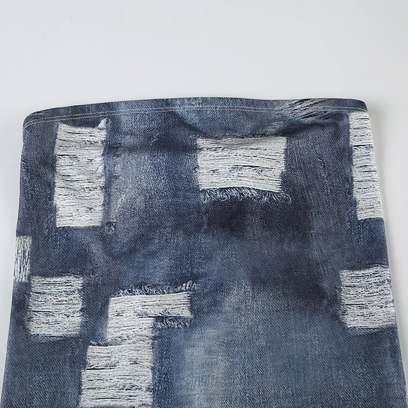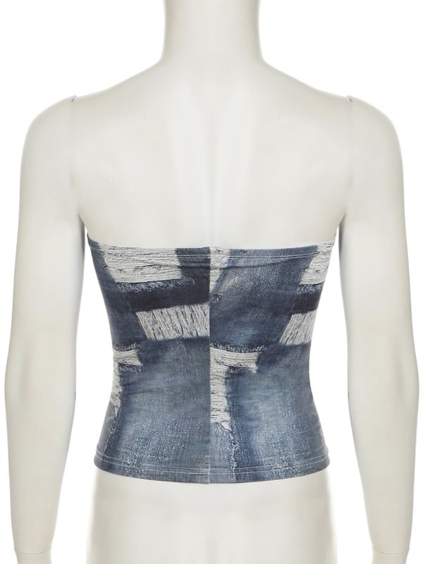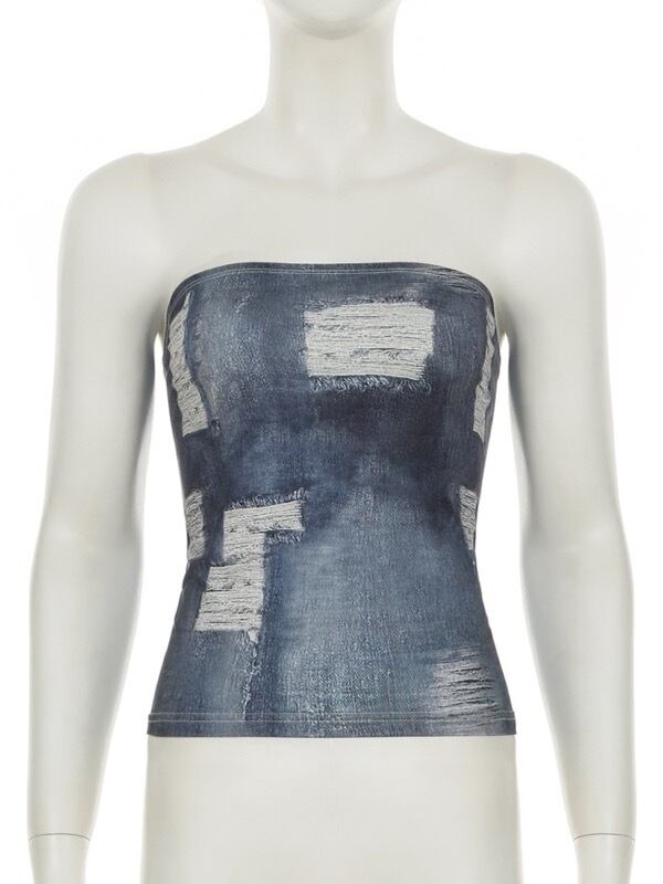 チューブトップ ベアトップ トップス デニム風プリント 細身 スリム タイト レディース