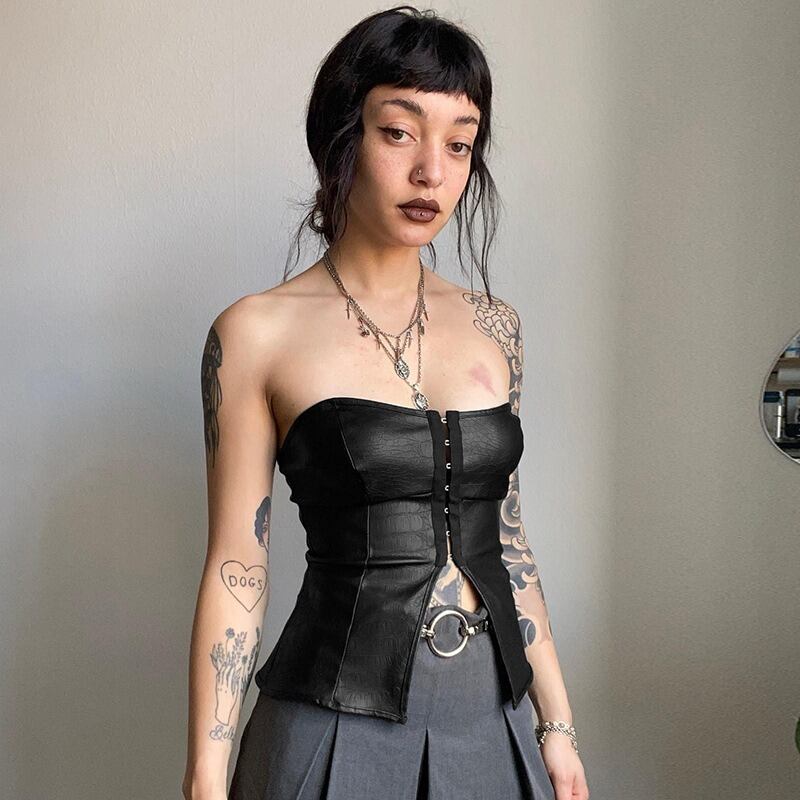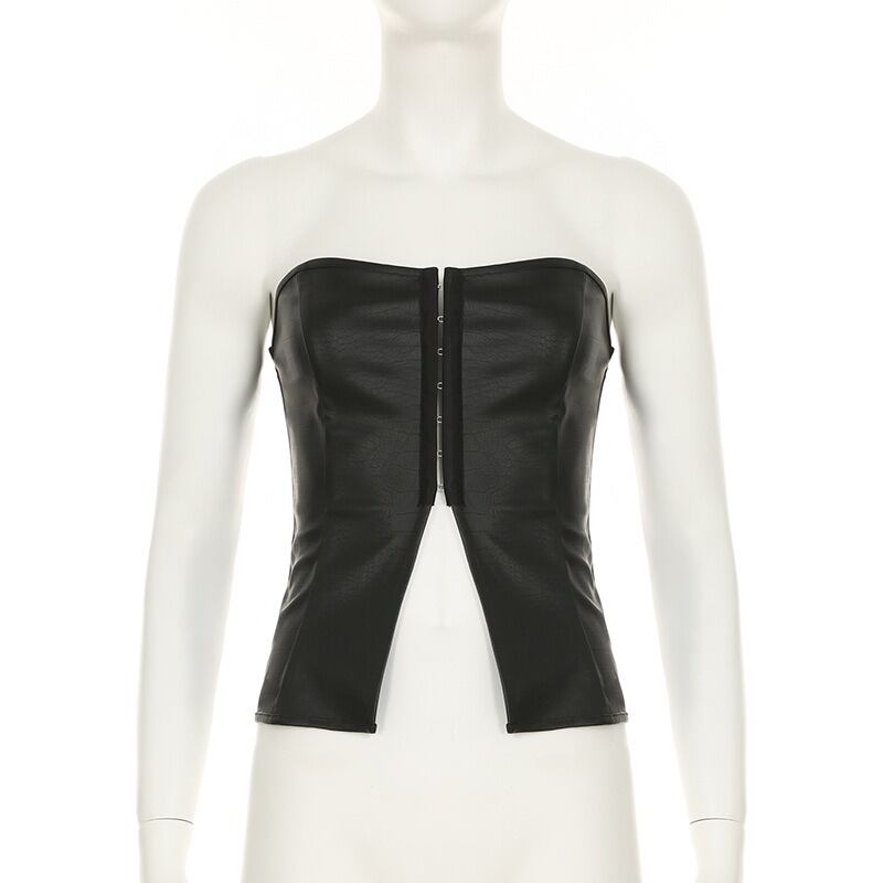 トップス チューブトップ ベアトップ スリット PU フェイクレザー 細身 スリム タイト