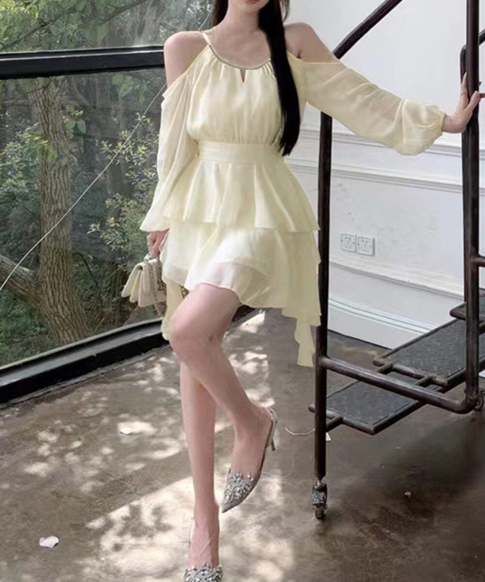ふわっと広がるシフォン素材とオフショルダーのデザインがフェアリー感をアップ。ウエストマークでスタイル良く見せながら、愛らしいフレアシルエットに仕上げます。サンダルやミニバッグを合わせて、お出かけやデートに最適なアイテムです♪