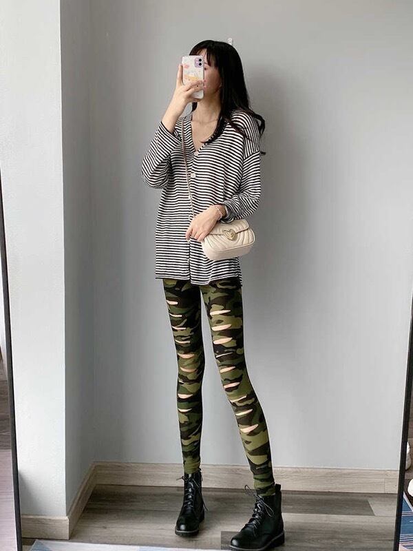 トレンドを押さえた、スリムなシルエットのダメージ加工レギンスパンツが新登場!今季のスタイルに欠かせないアイテムで、迷彩柄がカジュアルさを引き立てながら、脚を美しく見せるデザインとなっています。フィット感が良く、ストレッチ性に優れた素材を使用しているため、動きやすさも申し分ありません♪