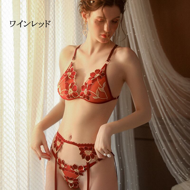 刺繍 ガーターベルト付 ブラとショーツセット セクシーランジェリー