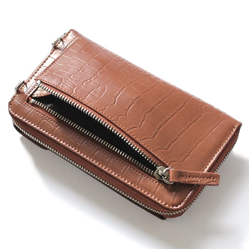 根強い人気のクロコ型押し加工を施した牛革のスマホポーチが新登場です!このポーチは、ラウンドファスナータイプの収納と背面のファスナーがお財布の役割をしてくれるので、