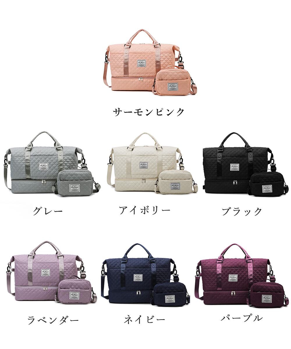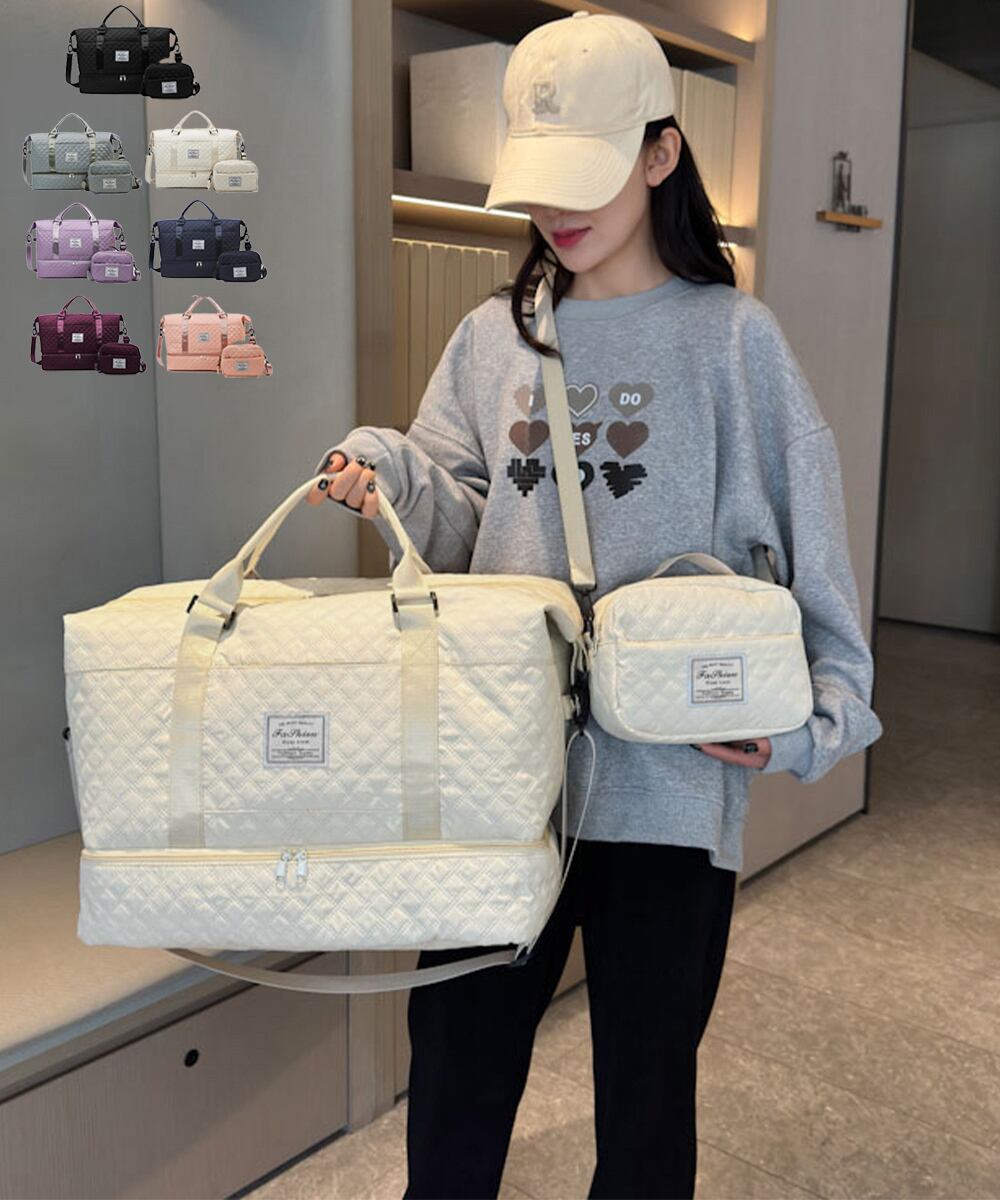 ふんわり手触りのキルティング生地を使用したボストンバッグとショルダーバッグの2点セットが新登場!ボストンバッグには1~2泊程度の荷物、ショルダーバッグには化粧道具やスマホ、お財布などをたっぷり収納して持ち運べます。ボストンバッグ、ショルダーバッグ共に長さ調節、取り外しが可能なショルダーベルト付き。旅行はもちろん、普段使い、ジムや部活でのスポーツシーン、アウトドア用品の持ち運びなど様々なシーンでお使いいただけるアイテムです♪
