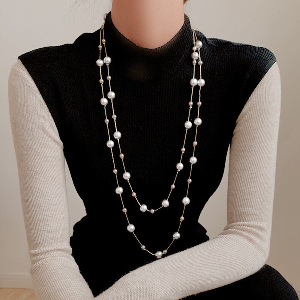 フェイクパールと華奢なチェーンを連なったデザインが上品で女性らしい雰囲気のロングネックレスが登場しました!そのままでも、二重、三重にしてレイヤースタイルにしてもお使いいただけます。結婚式などの華やか席は勿論、カジュアルなニットにもきちんと感をプラスしてくれるので、幅広くお使いいただくことが出来ます♪