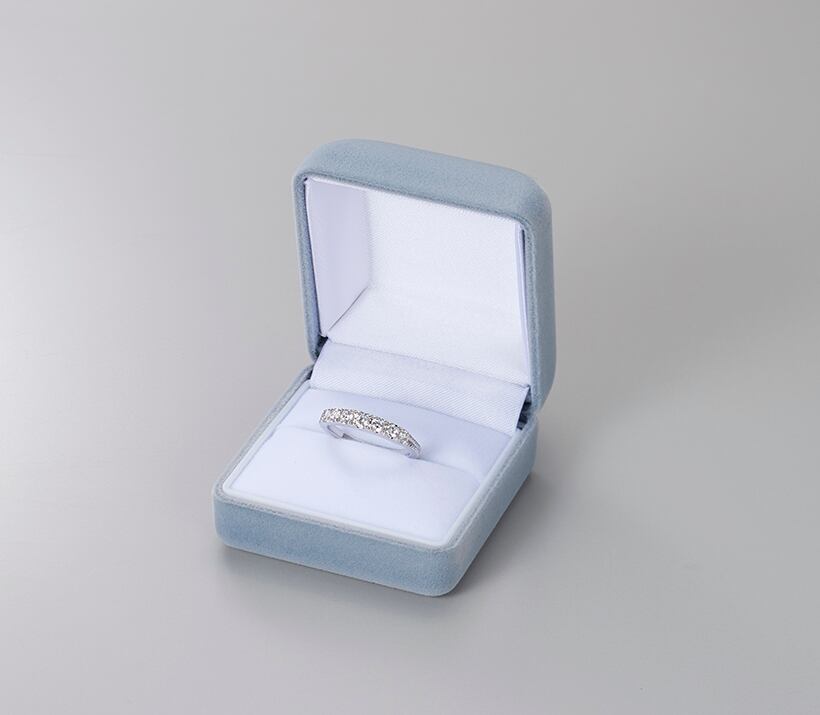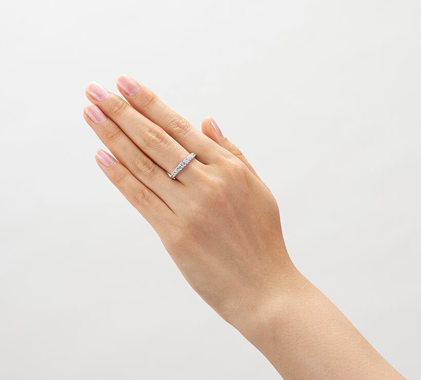*3mmから2.7mmのキュービックジルコニア、合計0.44カラットの輝きが上質な豪華さで指を美しく引き立てます。