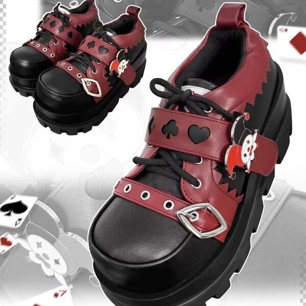 1. 「ゴシック調の奇抜なデザイン トランプをテーマにしたパンク系厚底シューズ」は、独自のトランプデザインと高めの厚底が特徴。スタイリッシュでありながら目を引くこのシューズは、どんなスタイルにもマッチします!おしゃれな足元を実現し、あなたを一層魅力的に演出してくれるでしょう♪