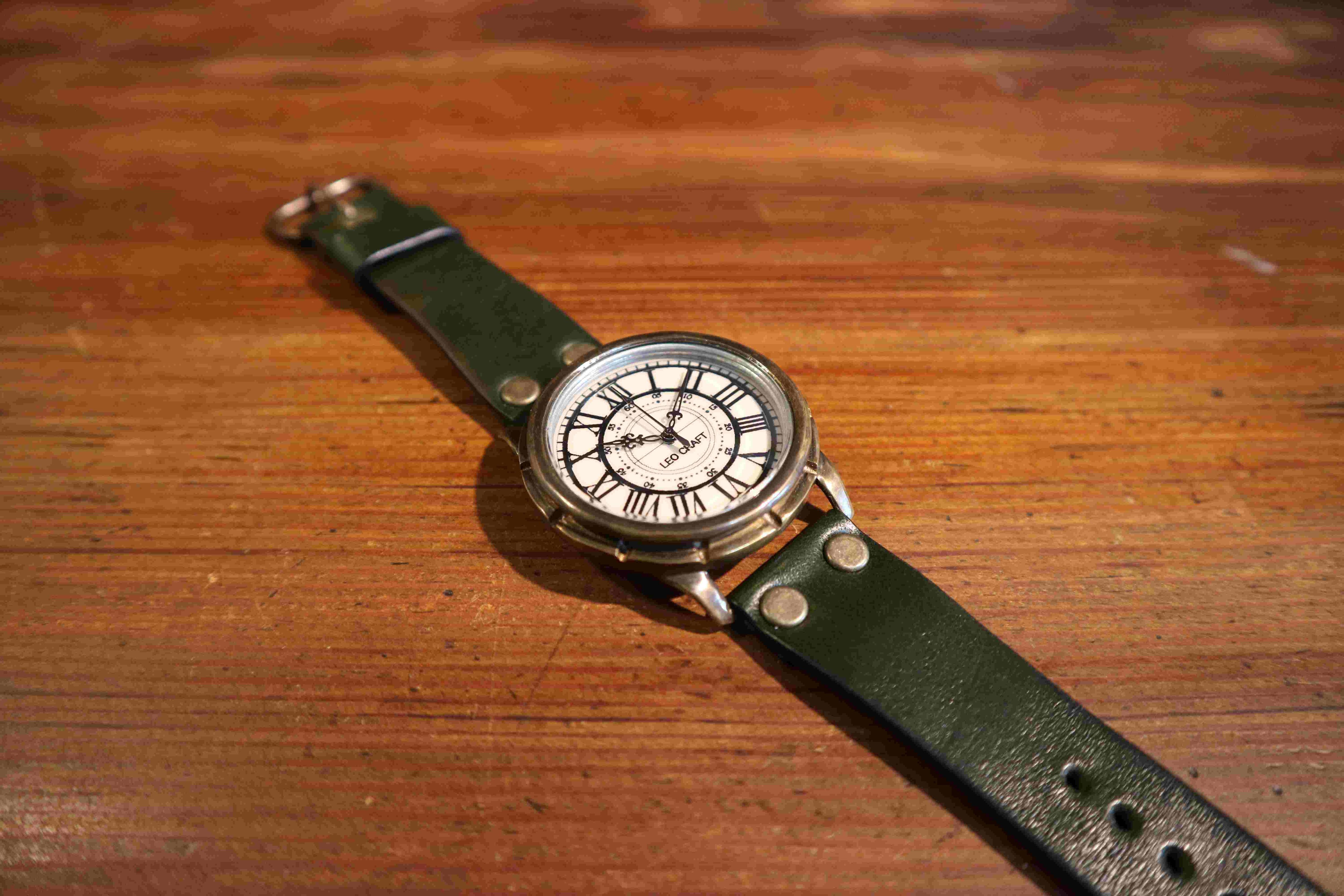 *真鍮やレザーなどの素材を用い、本体ケース、文字盤、レザークラフトの技術で製作。