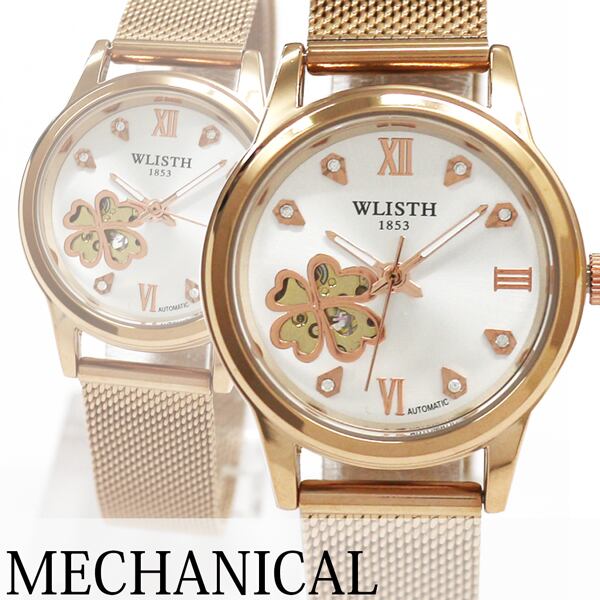 自動巻き腕時計 クローバー ラインストーン ピンクゴールドケース 機械式 WSA009-WHPG レディース腕時計