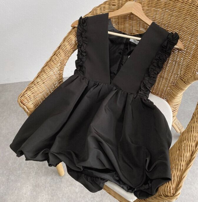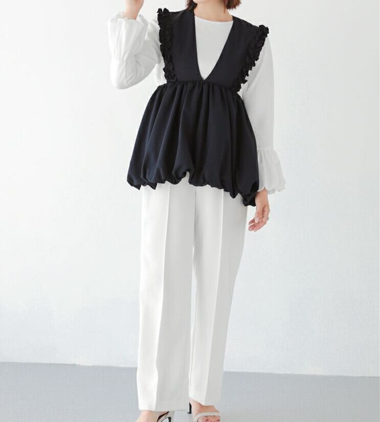 1. 深めにカットされたVネックが、デコルテを美しく見せ、洗練された印象を演出します。ノースリーブデザインで、動きやすさと涼しさを兼ね備えています♪